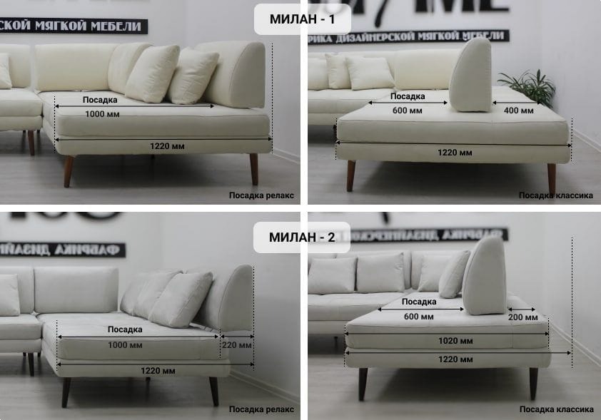 Отличительной особенностью углового дивана Милан-1 от углового дивана Милан-2 является широкая оттоманка 1240мм и возможность поставить его вплотную к стене. Она может стать отдельным элементом и выполнять роль тахты, кушетки или софы.